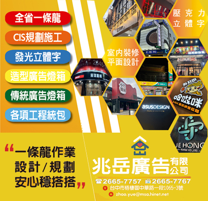 兆岳廣告有限公司 - 台中招牌、台中廣告招牌、無接縫燈箱、壓克力標誌牌、展覽廣告製作